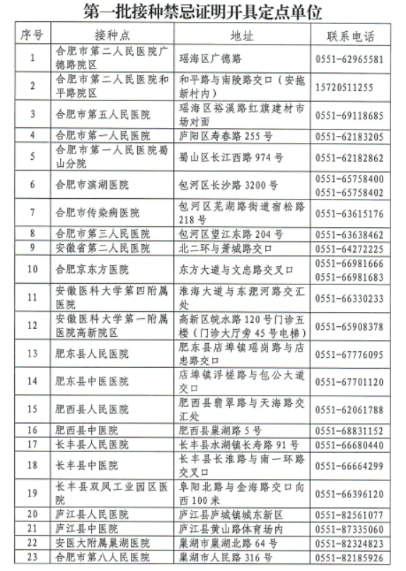 附件1:合肥市接种禁忌证明开具定点单位