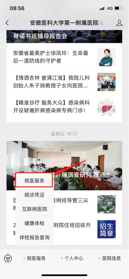 微信搜索“安徽医科大学第一附属医院”微信公众号,点击“就医服务”