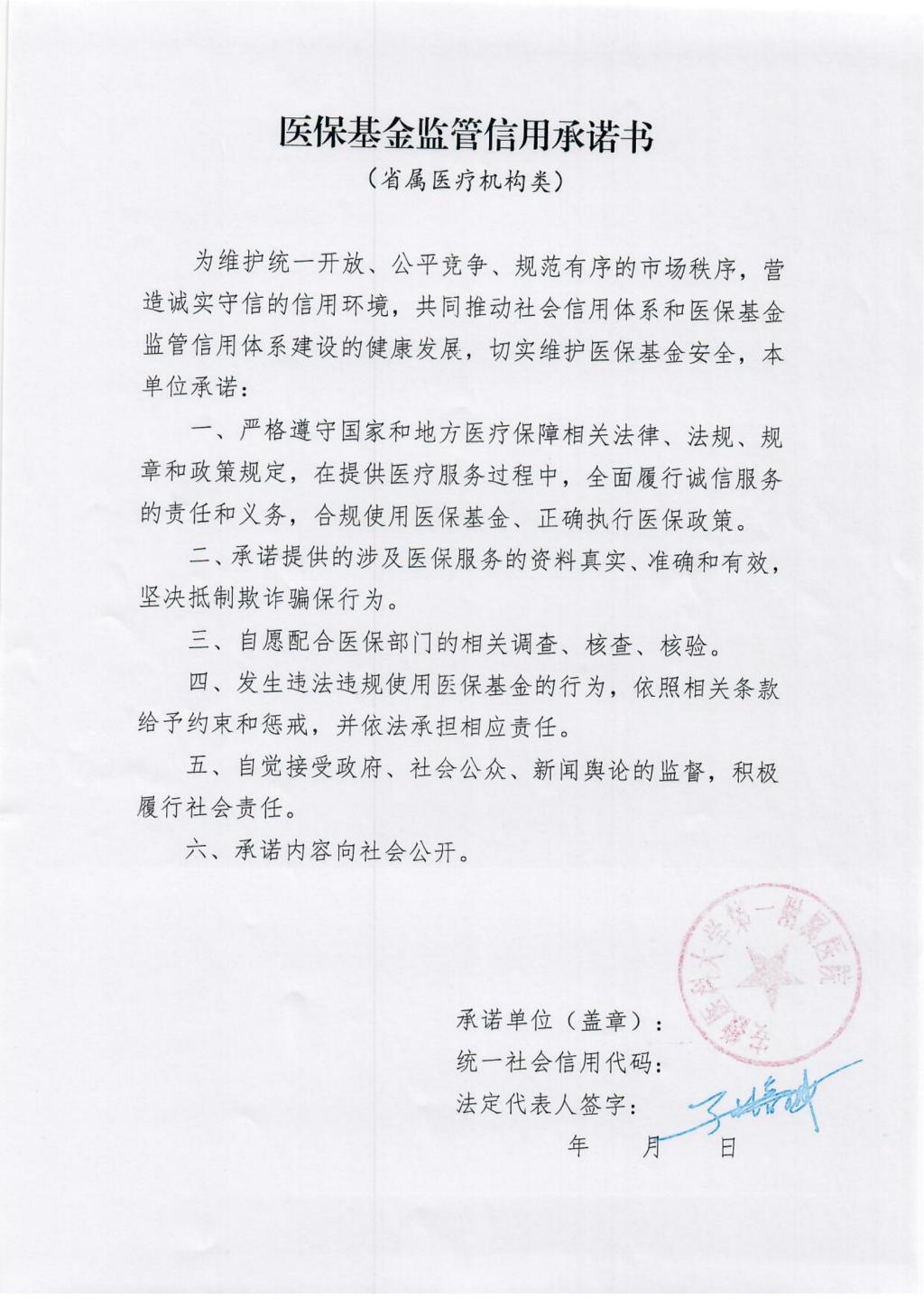 医保基金监管信用承诺书
