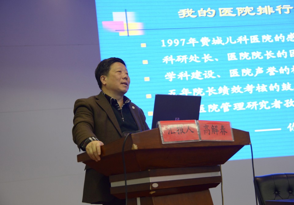 2月28日上午,医院特别邀请复旦大学医院管理研究所所长高解春教授进行《医院学科建设与中国医院排行榜探索》专题学术讲座。院领导梁朝朝、余永强、金小干、王润玲、费广鹤、王珩、 戴晓支、孙国平及相关职能处室负责人、党总支书记、临床医技科室负责人、教研室主任、护士长、研究生等500余人参加了讲座,讲座由院长余永强主持。高解春教授结合自身医院管理实践经验,对学科建设的重要意义、学科建设与评估、重点学科管理等核心内容进行了系统深入的讲解,对医院职业管理的定义、未来医院发展方向、医院运行机制改革等内容进行了分析和介绍。同时结合我院实际情况,对医院的学科建设与发展提出了诸多宝贵建议。高解春教授的讲座贴合实际、深刻透彻,引起了现场的广泛共鸣。讲座期间,高解春教授多次与在场的专家主任交流互动,就绩效管理、学科建设、运行机制等问题共同探讨,现场气氛十分活跃。