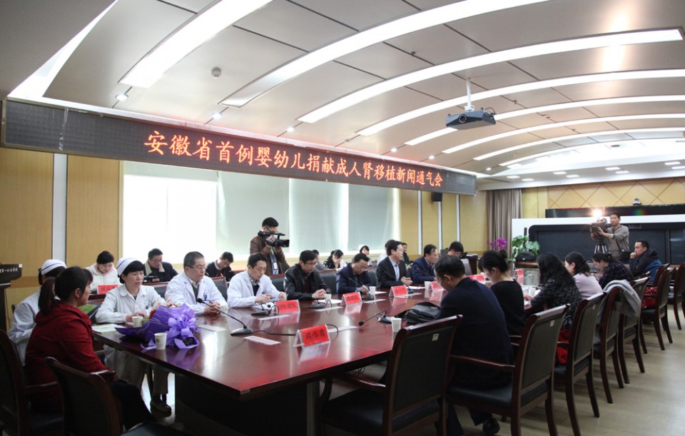 3月3日下午,医院在干二楼会议室召开新闻发布会,宣布安徽省首例婴幼儿捐献成人肾移植手术成功,患者康复良好,即将出院。国家、省、市十余家媒体对此做了集中报道。
