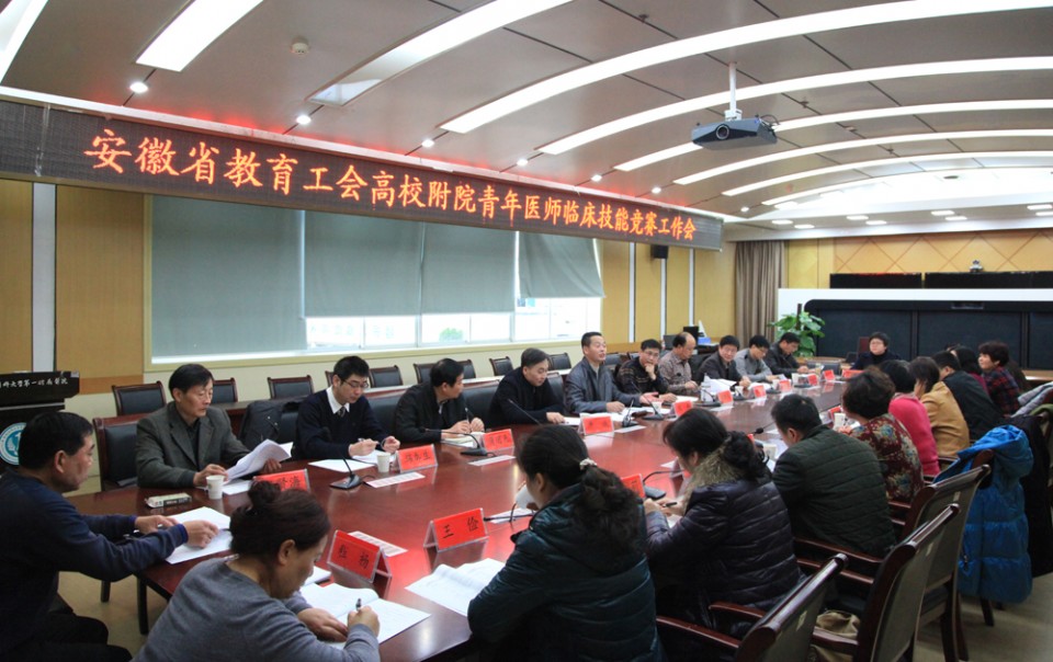 12月3日上午,安徽省教育工会高校附属医院青年医师技能竞赛意向协调会在我院干二会议室召开。省教育工会主席凤桦、高校附属医院近10家单位的工会主席、分管领导参加了会议,院党委副书记戴晓支致欢迎辞。 省教育工会主席凤桦就高校附属医院青年医师技能竞赛通知作了解读,承办单位蚌埠医学院第一附属医院分管领导对竞赛程序的规划作了说明。10家附院经过讨论达成共识,积极响应。