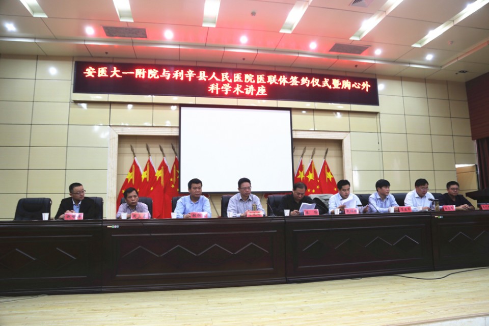 10月18日,医务处处长李元海、心脏外科葛建军、胸外科张仁泉等一行,应利辛县人民医院邀请赴该院洽谈医联体合作事宜。利辛县委常委、副县长秦坤、县卫生局局长武体鹏及县院领导班子成员及全体医护员工出席签约仪式暨学术交流座谈会。秦县长代表利辛县对我院专家的到来表示衷心的感谢,并向与会专家介绍了利辛县的基本情况及医疗卫生现状。李元海处长代表专家组介绍了我院的发展概况,并对医联体的具体合作事项进行了说明。随后,我院李元海处长与利辛县人民医院张志军院长共同签署了医联体框架协议。