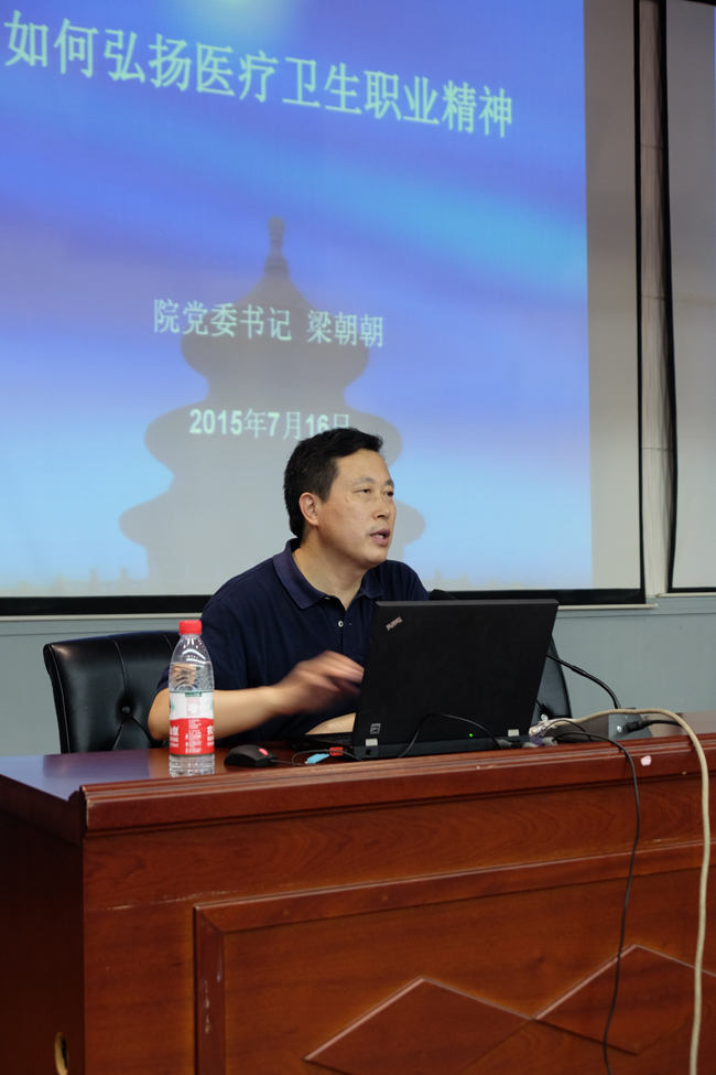 7月16日晚,院党委书记梁朝朝在内科医技四楼会议中心,为2015年度入党积极分子培训班的学员作了题为《如何弘扬医疗卫生职业精神》的最后一次集中授课。梁书记从医疗卫生职业精神的概念和内涵、背景和溯源、现状和反思、探索和展望四个方面,结合医院实际工作,深入浅出地为学员们作了生动的阐述。课后进行了结业考试,来自全院43个党支部的63名学员参加了考试。