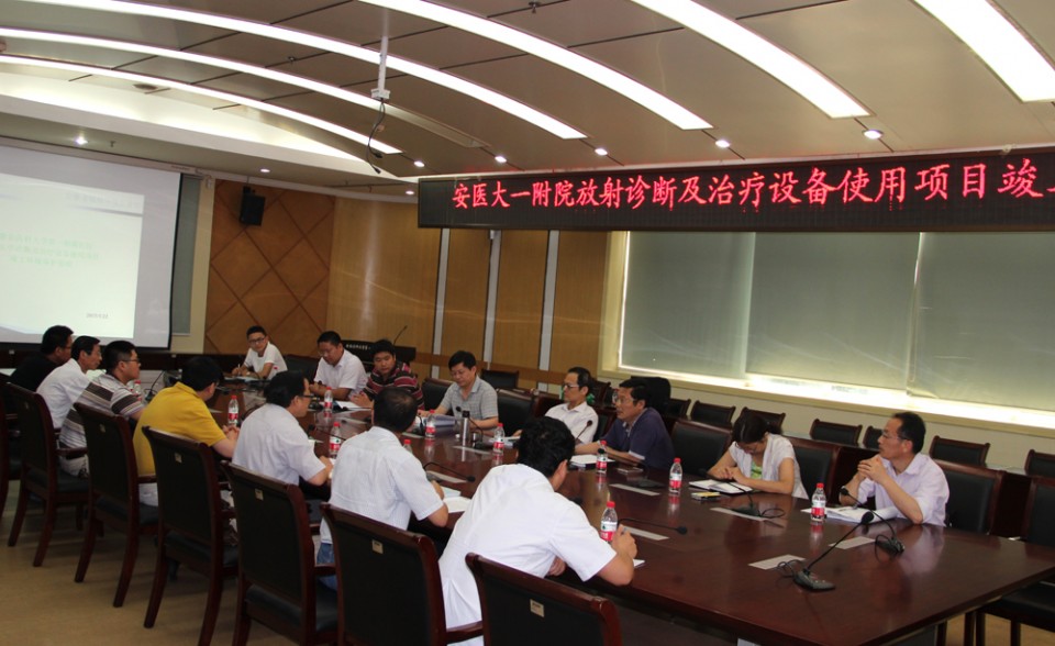 在干部二楼会议室,医学工程部张晓斌主任向项目评审组汇报了我院辐射安全防护工作相关情况,项目评审组同时听取了安徽省辐射环境监督站对我院42台医学诊断及治疗设备使用环境影响报告。