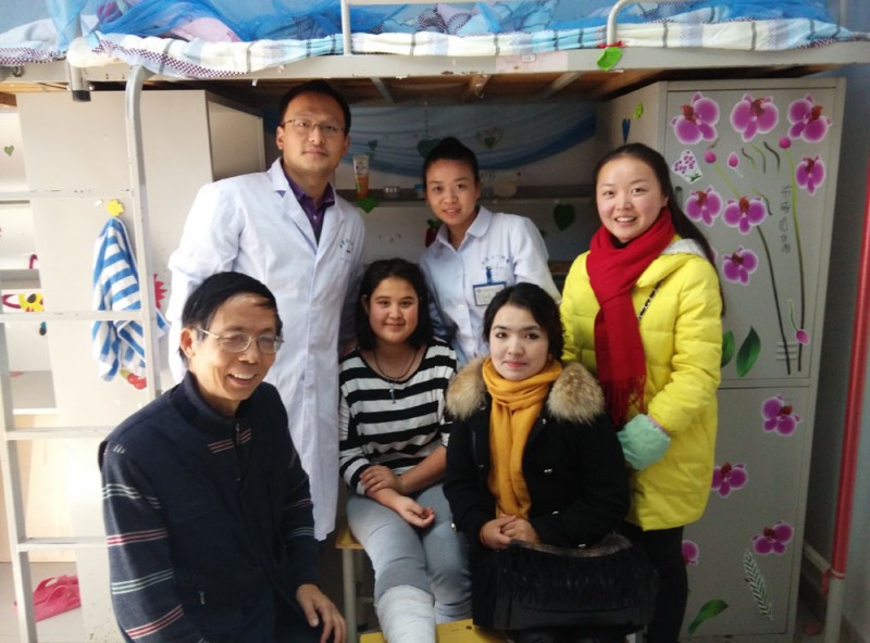 2014年12月24日,医院创伤骨科护士王群、医生张琦来到位于磨店乡的合肥幼儿师范高等专科学校,上门为一周前在该科出院的新疆女学生凯丽比努尔做骨折固定手术后的康复指导。创伤骨科病区丁晓云护士长告诉记者,凯丽比努尔是合肥幼儿师范高等专科学校2014级新疆学生,因不填骨折入院治疗。住院期间,科室充分考虑到凯丽比努尔的饮食和生活习惯,做了特别的护理。同时,为了解决语言沟通的难题,年过7旬的合肥退休职工许勤国老人当起了志愿者,做好翻译,一同用爱心共筑民族情。