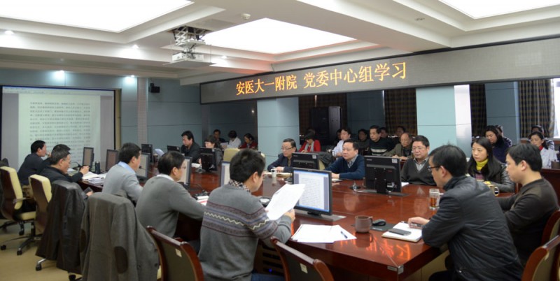 12月24日下午, 医院在行政楼第二会议室召开党委中心组理论学习会,党委书记梁朝朝主持会议,党委副书记戴晓支作中心发言,院党政领导班子成员、二级机构主要负责人、党总支书记、党委各部门主要负责人参加了会议。会上,集中学习了中共安徽省委办公厅印发《关于深化“四风” 整治、巩固和拓展党的群众路线教育实践活动成果的实施意见》,传达了大学关于开好2014年度处级及以上党员领导干部民主生活会的文件精神。随后,党委副书记戴晓支就近期参加党校培训的学习内容做了介绍,并结合医院当前工作谈了自己的学习体会。