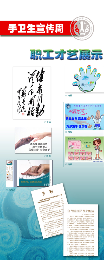 最具医院文化特色的是,活动征集了医院在职职工自编、自拍、自做的30多幅与手卫生有关微电影、视频、摄影、书法、绘画等作品,10月31日下午的舞蹈、演讲、芭蕾、儿童洗手舞、黄梅新唱、诗歌朗诵等才艺展示将活动推向高潮。