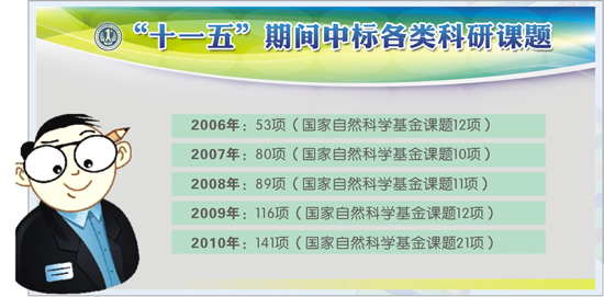2010年,医院继续加强各级各类科研课题的申报工作,努力提高科研档次和水平,多渠道争取科研经费,共获得纵向经费1068.5万元;组织申报各级各类科研项目375项,中标课题141项,其中国家自然科学基金项目21项,973子课题1项,省自然科学基金项目15项,省教育厅科研项目25项,省卫生厅临床医学应用项目27项,中标国家级课题在全省省属院校中再居榜首。全年各类项目结题215项。其中国家自然科学基金课题10项,教育厅课题65项,科技厅课题23项,卫生厅课题117项。
