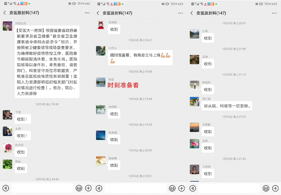 除夕,本是万家团圆的日子。2019年1月24日晚18:40分,在满屏的祝福信息中,有一条信息格外突出:“为确保做好疫情防控工作,安医大一附院春节期间取消休假,全员在岗。”该院放射科主任刘斌第一时间在科室群里传达了医院指令和部署。