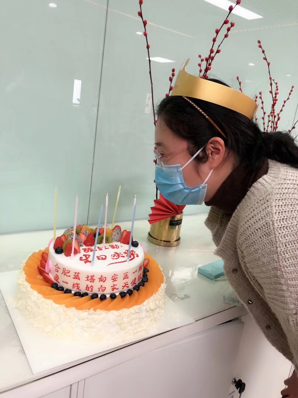 同时,院团委了解到青年突击队员张红影即将在隔离期度过生日,通过联络,爱心企业合肥蓝塔公司愿意捐赠蛋糕给抗疫勇士以表示支持。在半隔离区,团委工作人员“意外”拿出的精美生日蛋糕,让“寿星”惊喜不已,在向她送上暖心祝福后,寿星张红影和队友们度过了一个特别的生日,虽没有家人的陪伴,但医院这一群“亲人”却让她感受到分外温暖。问到有什么生日愿望,张红影大声说:“希望疫情早日结束,大家都能早点回家!”