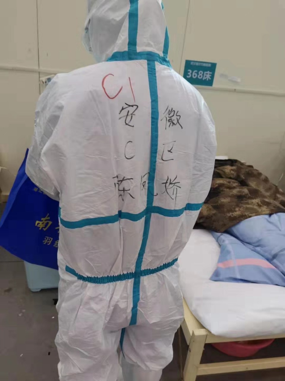 这时,358床的阿姨走过来问我:“小姑娘,你们是安徽来的吧?你们挺辛苦的,听说你们穿着这个衣服(防护服)后就不能吃、不能喝、不能上厕所。”