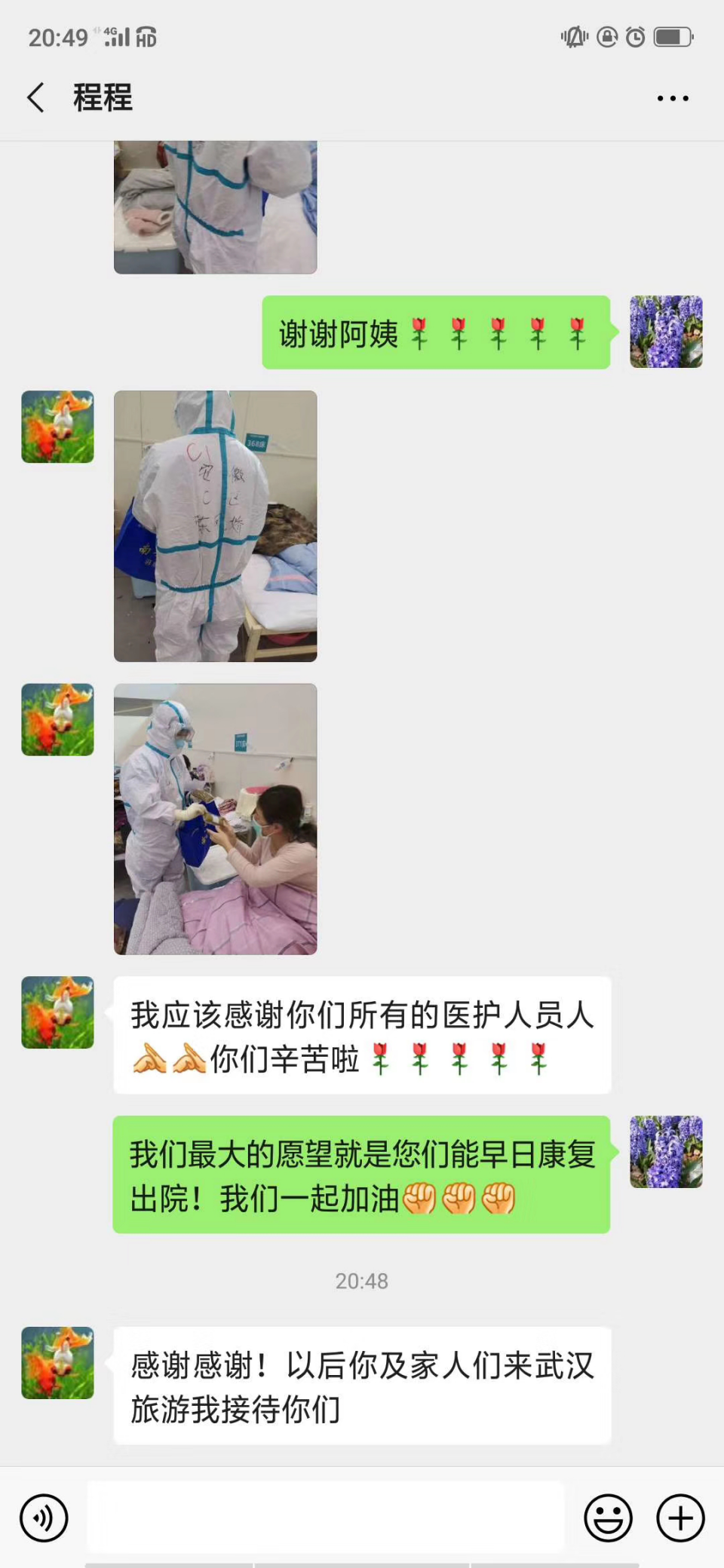 为了给我留下纪念,这位358床的阿姨便说帮我拍几张工作照。微信上阿姨留言说:“我应该感谢你们所有的医护人员,你们辛苦啦!以后你及家人们来武汉旅游,我接待你们。”