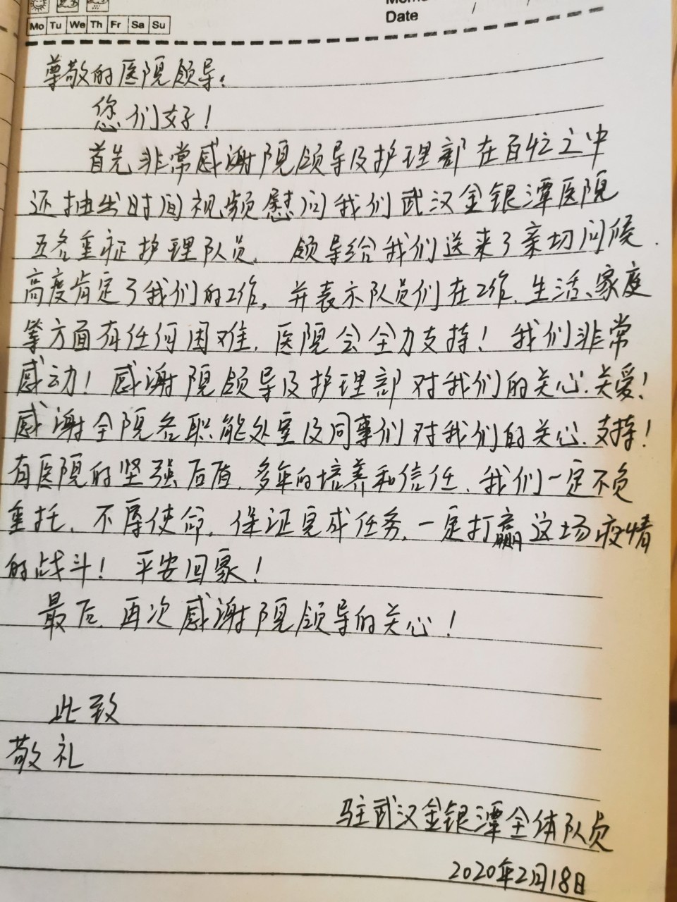 2月18日下午,院长梁朝朝、副院长孙国平代表全体院领导,与我院五位安徽省第一批(我院第二批)支援湖北医疗队队员进行了视频连线,对医疗队在武汉所做的工作表示高度肯定,问候了他们的生活起居及家中情况,并表示,医院是他们最坚强的后盾,无论遇到任何困难医院将全力予以支持。希望队员们充分发挥所长,保护好自身,共同打赢这场疫情防控阻击战。医疗队员随后也予以回信,感谢院领导和全院职工的关心和支持,一定不负重托、不辱使命,打赢“战斗”,平安回家。