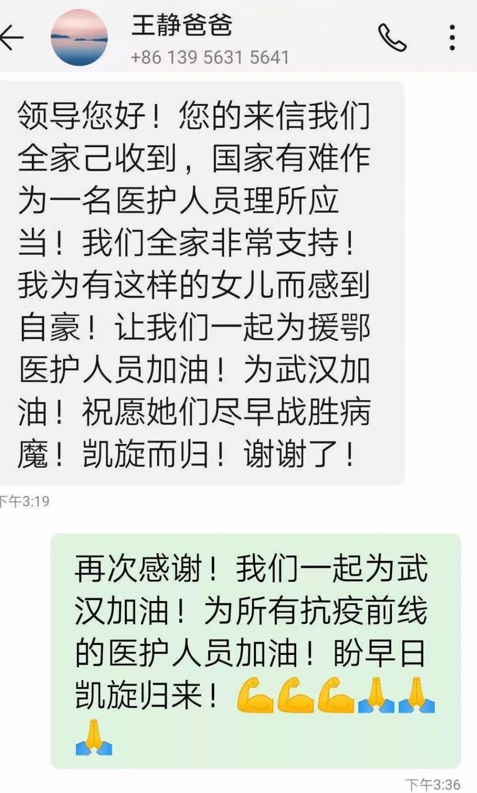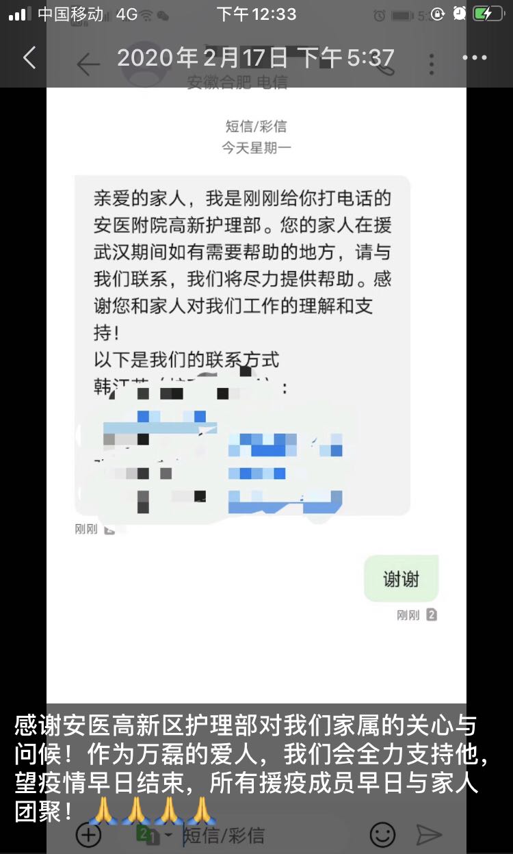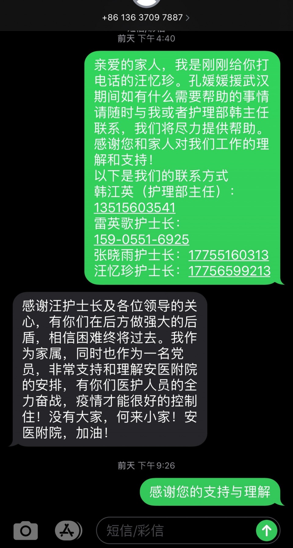 新生儿科孔媛媛的爱人收到短信后,回复说:感谢领导的关心,有你们在后方做强大的后盾,相信困难终将过去。我作为家属,同时也作为一名党员,非常支持和理解安医附院的安排,有医护人员的全力奋战,疫情一定能很好地控制住!没有大家,何来小家!安医附院,加油!