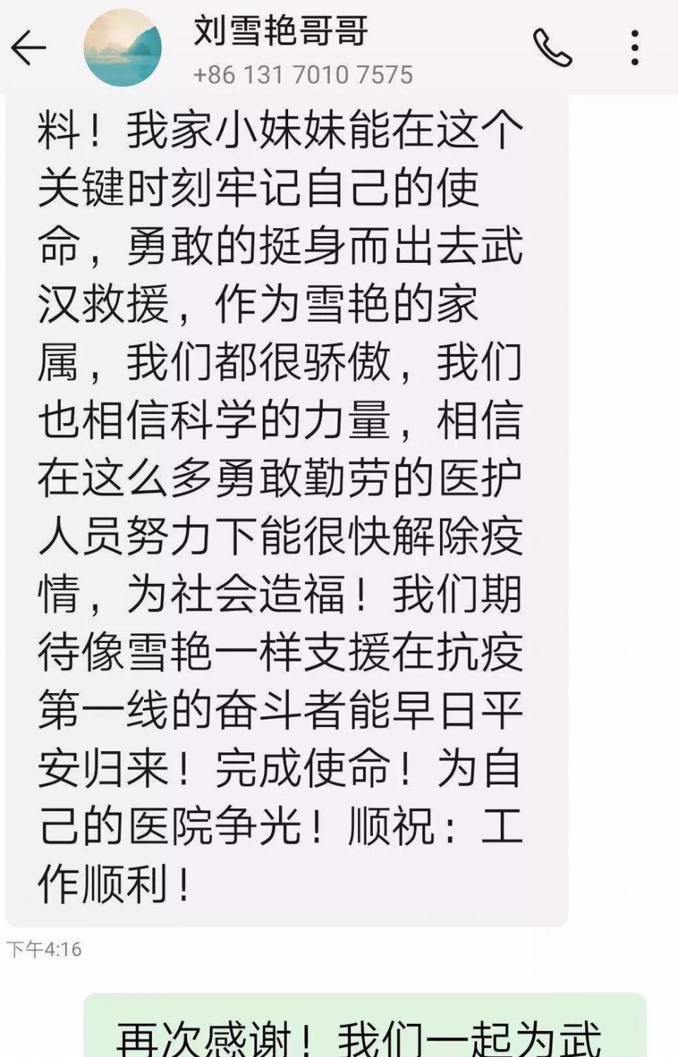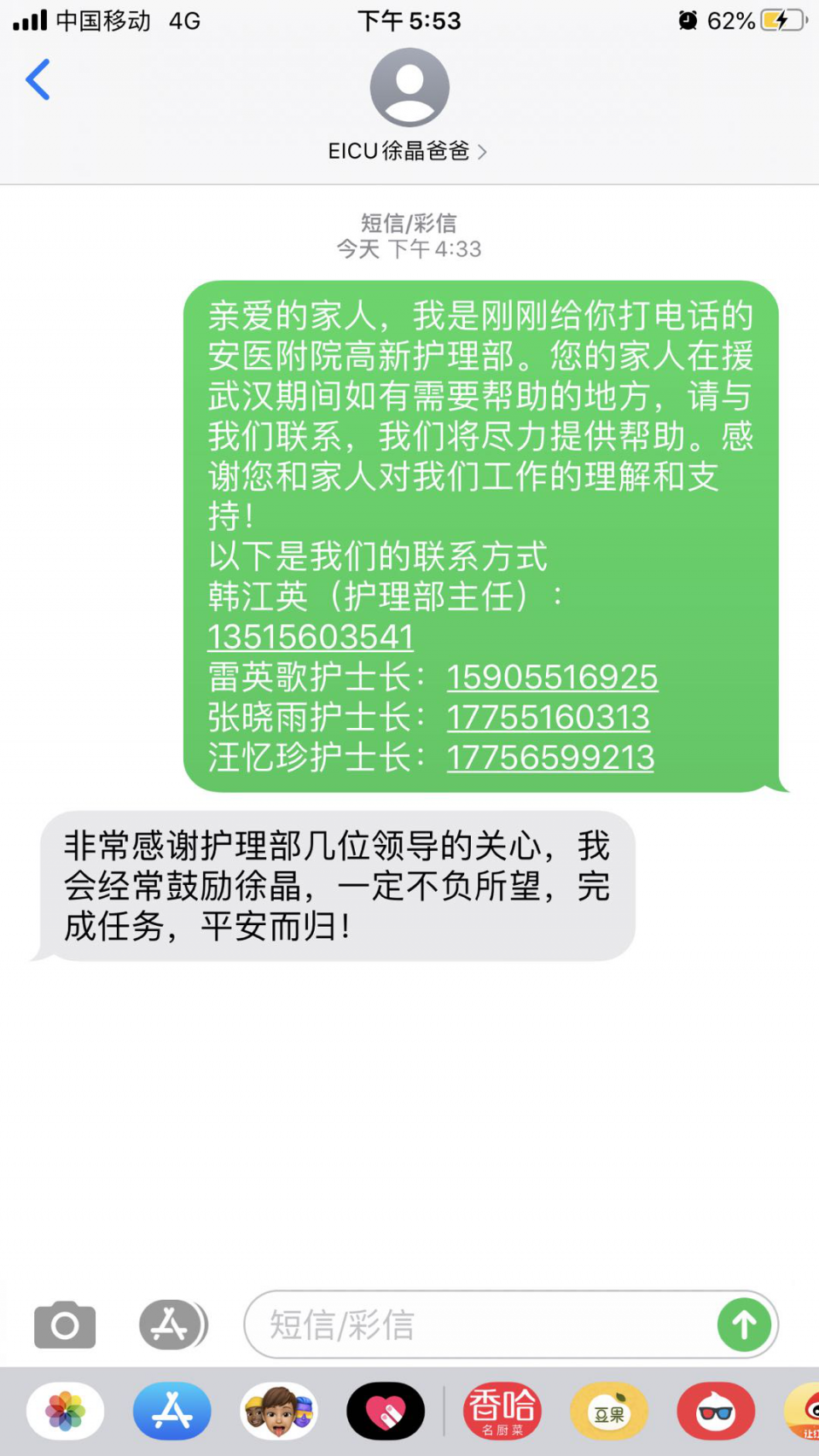 医院同时给每位支援武汉医务人员的家人发送了慰问短信,短信中附上了医院志愿者团队的联系电话。