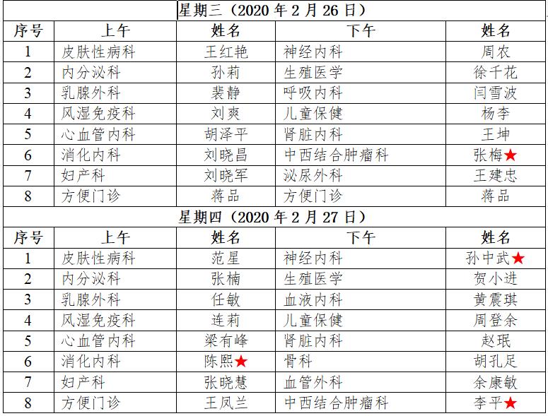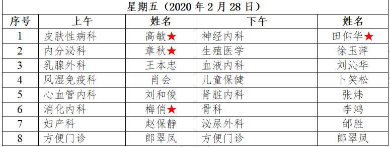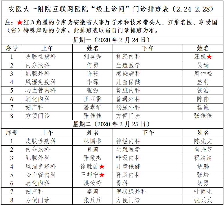 2月24日至28日我院互联网医院“线上诊间”门诊排班如下: