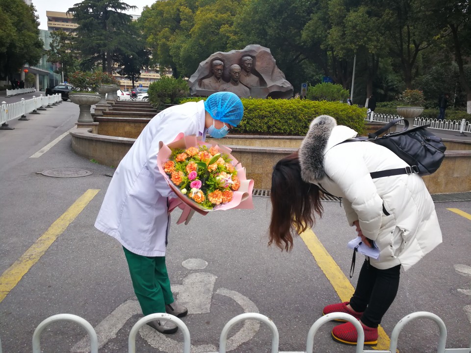 2月24日上午,我院一位新冠肺炎患者出院时和她的主管医生之一苏丽自拍留念,并向苏丽医生赠送鲜花鞠躬以表感谢,苏丽医生顺势鞠躬回礼。医患之间的尊重和互爱,再现了百年前“梅滕根”之礼。