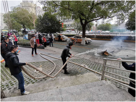 2月24日,为了保证队员们的生活安全,医院第五批医疗队在武汉驻扎酒店开展了消防演练和培训活动。考虑到大批队员驻扎在快捷酒店,酒店内用电荷载重,加上酒店各区域均放置酒精等易燃品,容易诱发火灾,医疗队主动联系酒店组织此次消防演练和消防知识培训。中午11点,消防演练和消防知识培训正式开始。首先由驻地工作人员向医疗队员详细介绍了驻地的火警报警器及消防通道,并现场演示。在诱发烟雾报警器后,队员们根据先前的介绍,3分钟中内迅速由各楼层消防通道行出驻地外广场。第五批医疗队领队、高新院区副院长张泓为大家演示灭火器使用方法,并指挥队员们连接水枪喷头、寻找消防栓、连接水管、拧开水阀等系列操作。医疗队员梁兴林手持水枪喷头,准确命中着火点,迅速灭火。他感慨道:“水枪中喷出的是冬日的凉水,但我们心中无比温暖,大家一定会注意安全,加倍努力,战胜疫情!”