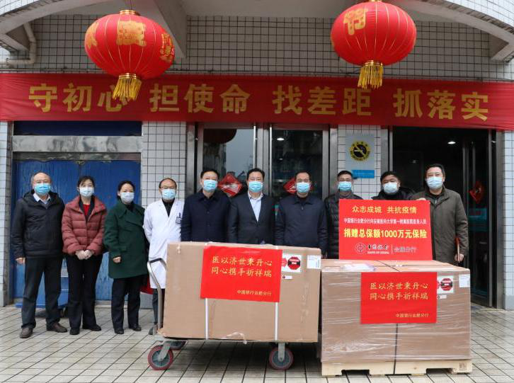 2月28日上午,中国银行安徽省分行程祥副行长一行5人赴我院捐赠价值112万元PB980 型号呼吸机2台,并免费为武汉前线和院内抗疫一线 631 名医护人员购买了总保额为1000万元的抗击新冠肺炎疫情保险,院长梁朝朝、副院长周典、党委副书记戴晓支等院方代表参加捐赠仪式。