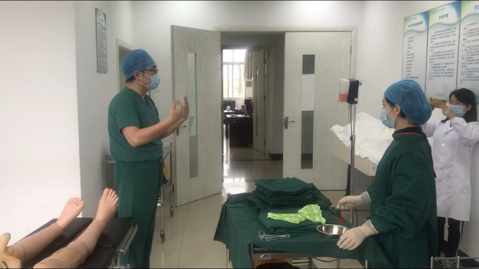 眼看着医院理论课线上教学开展的如火如荼,善于创新的临床技能中心主任张志功再也坐不住了。他主动与本学期有《临床技能训练课》的2016级临床医学“5+3一体化”的同学们取得了联系,在得知学生们希望提前熟悉课程内容后,他立即召集中心人员深入讨论了线上实验课开展的可行性。经过慎重考虑,选择了学生在家就能自行练习的七步洗手法、消毒铺巾、换药、打结等训练项目作为课程前预习课。