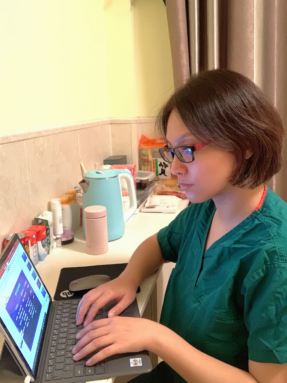 “世上无难事,只怕有心人!” 在医院为隔离病房医生准备的临时住所里,许敏老师加班修改幻灯,课件中加入多个临床病例以培养学生诊断思维能力;笔记本电脑、手机齐上阵,并利用蓝牙耳机增强录音效果等等。当然如此大规模在线教学前所未有,遇到网络拥堵、语音录不上怎么办?她就利用夜里一点钟以后的网闲时间、隔离病房清洁区的碎片空闲时间录课、上传课件,避开高峰期、提前预约发布。为防止预约发布漏洞,每次开课前一小时会再次反复确定是否发布成功。雨课堂崩了,就用微信沟通答疑 ...... 想尽办法,确保线上教学正常进行。因所有课程都在隔离期间完成,同学们亲切地称她为“隔离老师”。