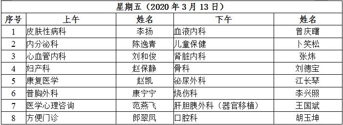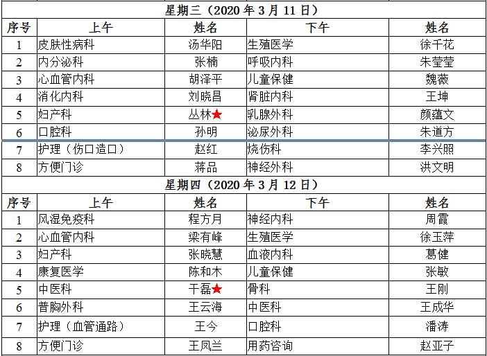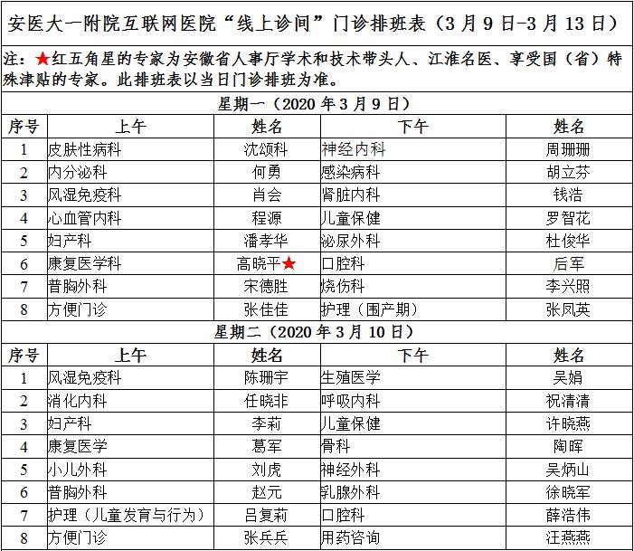 3月9日至13日我院互联网医院“线上诊间”门诊排班如下: