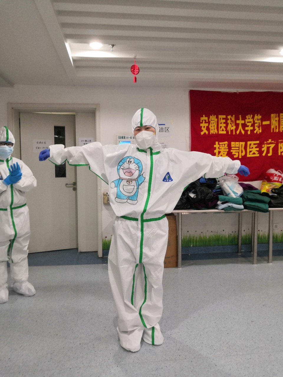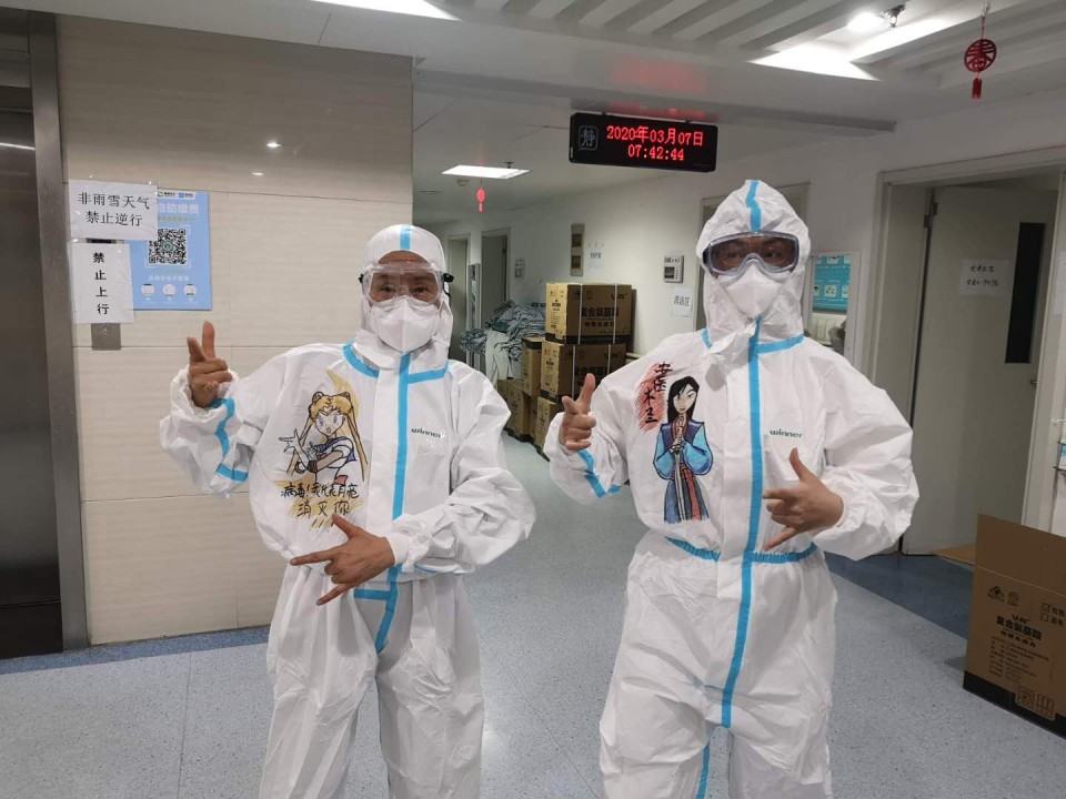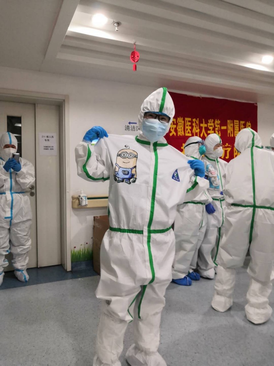 三八节前夕,医院第五批支援湖北医疗队的女队员们收到了一份特殊的节日惊喜,白色的防护服被卡通画装点,花木兰、美少女战士、机器猫、海绵宝宝、小黄人、七仙女……医疗队里最年长的队员、59岁的徐爱晖主任穿上了“美少女战士”的白衣战袍:“我要代表人类,消灭病毒!”她说,这件“新衣”是最珍贵、最值得纪念的三八节礼物。这些卡通画的作者、安医大一附院援湖北医疗队员常浩说,平日里爱美的女性,穿上防护服就变成了女战士。三八节到了,就想给她们单调的防护服上留下一抹色彩,增添一份乐趣,为她们加油打气,缓解她们持续紧绷的精神状态。《天仙配》是安徽黄梅戏最著名的剧目之一,祝女队员们像七仙女一样美丽动人。给医疗队的队长、高新院区副院长张泓画的是“花木兰”,象征着援鄂抗疫就像木兰领军,必定凯旋。