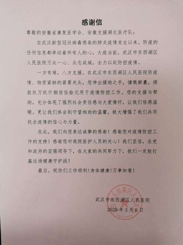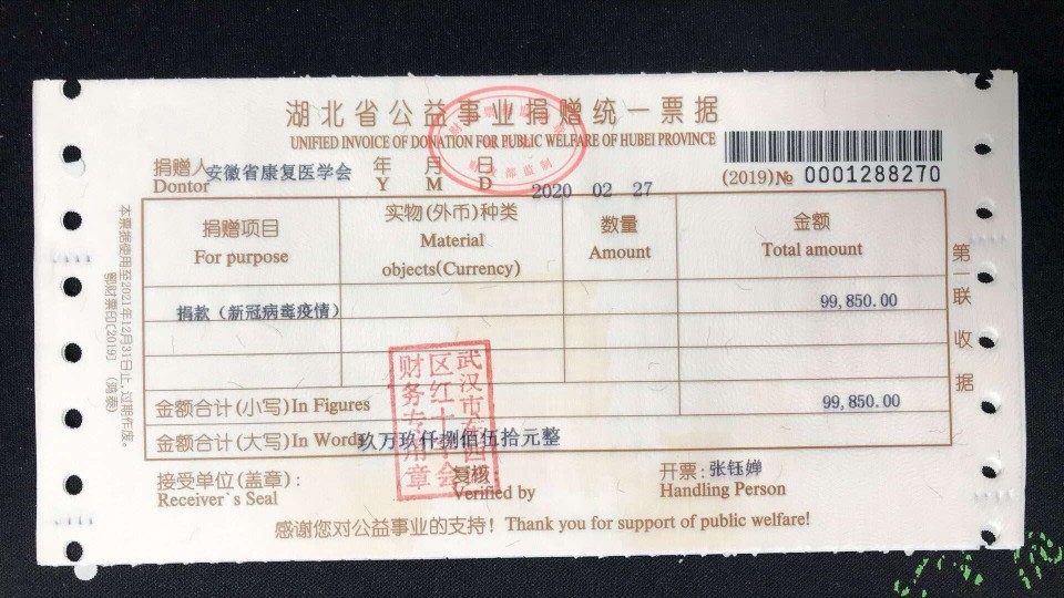 此次学会共募集善款99850元,经与安徽省卫健委联系,定点捐赠至武汉市东西湖区人民医院供抗疫一线使用,该院也是安徽省援助湖北医疗队驻地之一,另有安徽省康复医学会药物与保健专委会募集的价值4万余元的药品已捐赠给安徽省红十字会备灾救灾和捐献管理中心,由其统一调配发放到抗疫救灾一线。