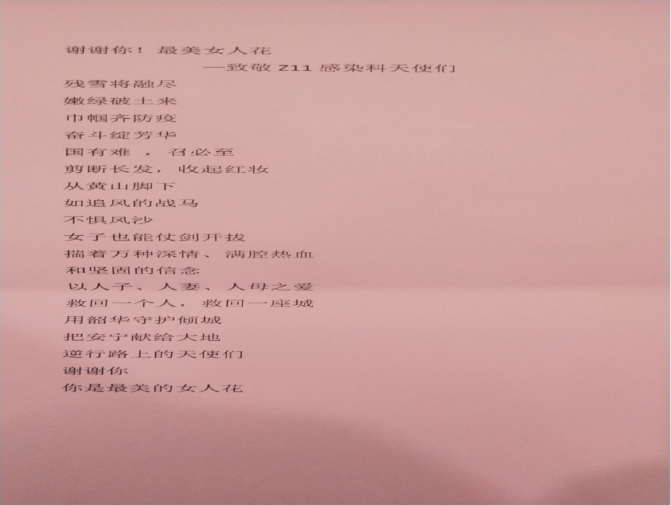 “国有难,招必至,剪断长发,收起红妆,从黄山脚下,如追风的战马,不惧风沙,女子也能仗剑开拔。”为表达对“皖妹子”驰援武汉举动的钦佩之情,肿瘤中心的胡琴老师有感而发赋诗一首,字里行间透露出对我院援鄂医疗队的肯定和对护理团队的赞许。