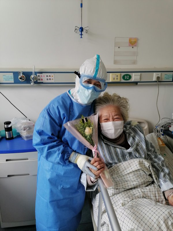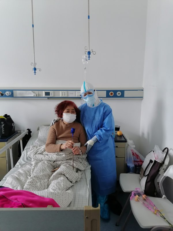 不仅仅是护理人员收到了节日祝福,在隔离病房,护士们将志愿者准备好的鲜花,连同最真挚的祝福送给每一位患者。“我们是战友,是真正的战友情,希望你能战胜病魔,我们也会全力帮助你们战胜病魔。”护士长方业香在为每一位病人献花时,还不忘给病人加油打气。78岁的龙奶奶对这段时间护士们的关心和照顾十分感谢,她说:“我一定会珍惜这段特殊的友谊,我会永远记着你们,这是我度过最难忘的妇女节。”