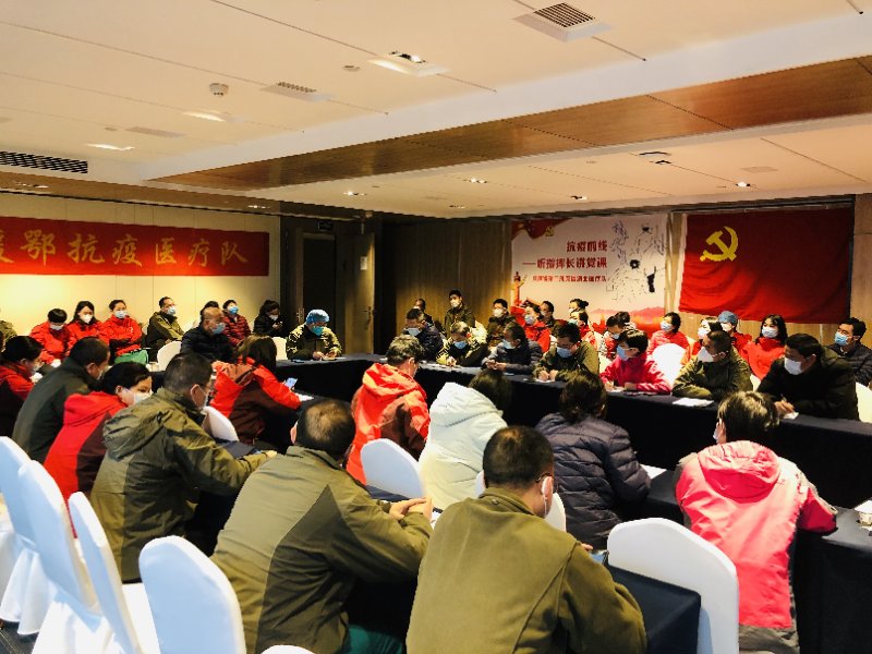 汪天平书记对医疗队前期的工作进行了简短总结,对大家的工作成绩表示了肯定,强调在抗“疫”一线,一个支部就是一个堡垒,一名党员就是一面旗帜。临时党支部必须发挥战斗堡垒作用,全体党员要继续发挥模范带头作用,发扬奉献精神,冲锋吃苦在前,积极救治并关爱患者,同时要彼此督促防护,确保安全。
