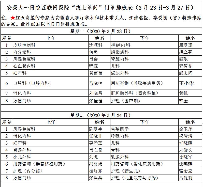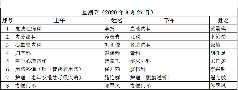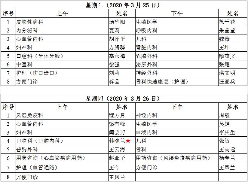 3月23日至27日我院互联网医院“线上诊间”门诊排班如下: