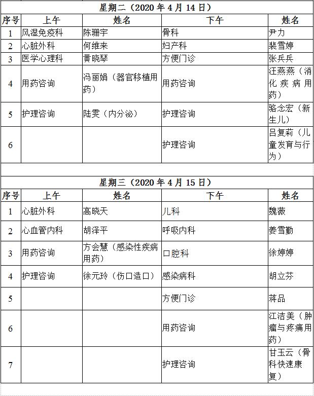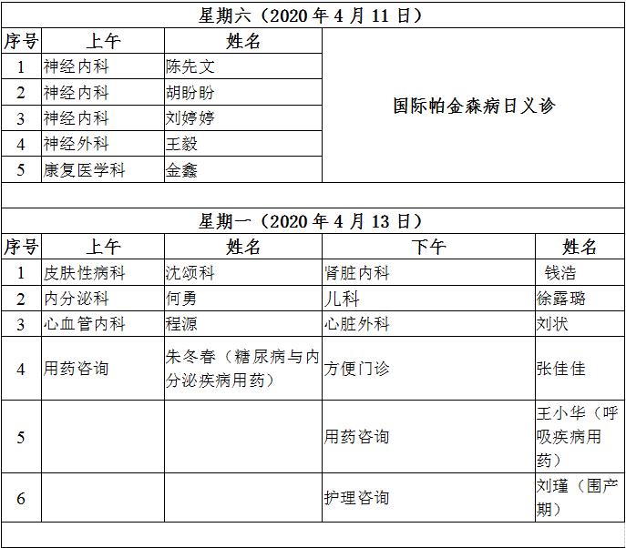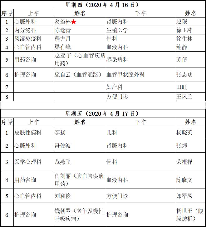 4月11日至4月17日互联网医院“线上诊间”门诊排班如下: