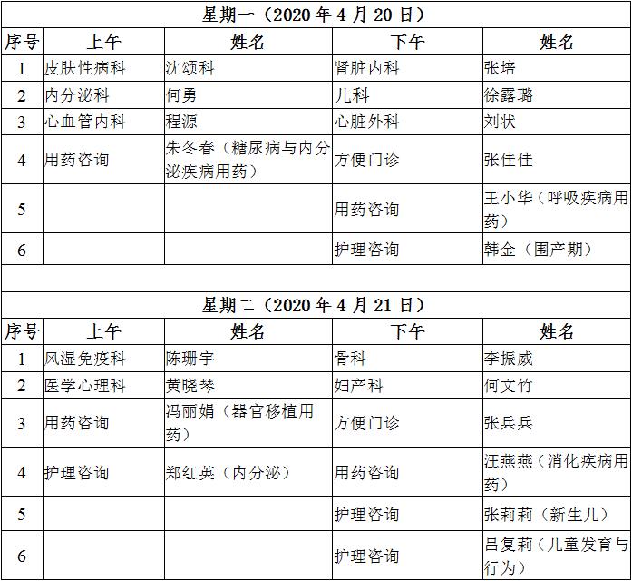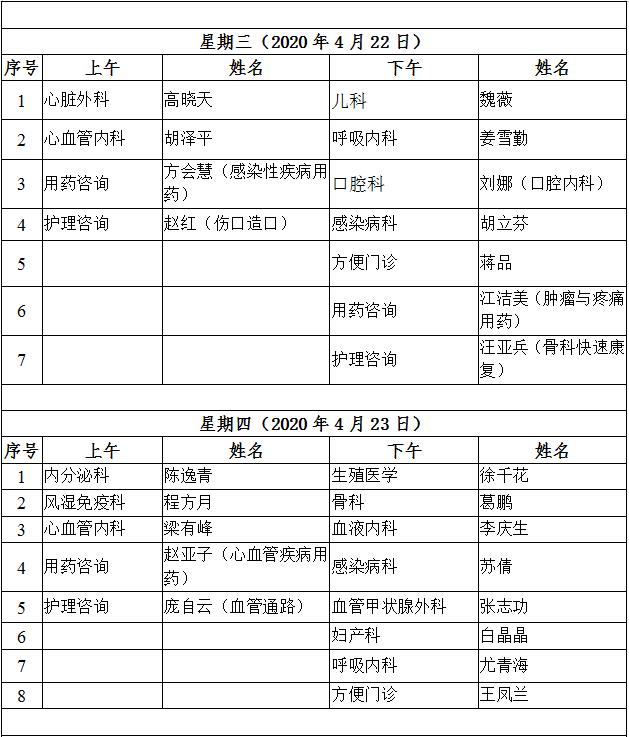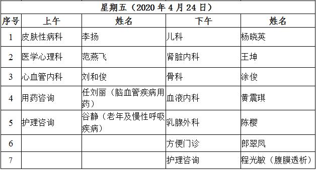 4月20日至4月24日互联网医院“线上诊间”门诊排班如下:
