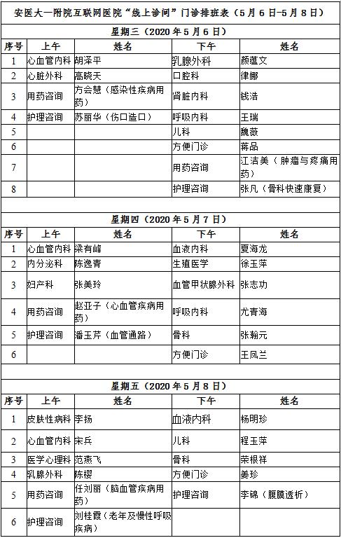 5月6日至5月8日互联网医院“线上诊间”门诊排班如下: