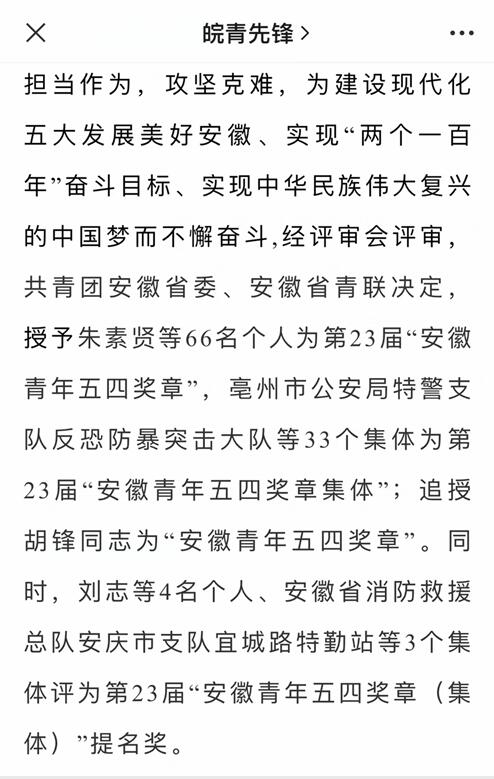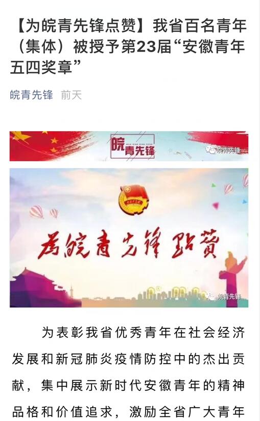 为表彰我省优秀青年在社会经济发展和新冠肺炎疫情防控中的杰出贡献,集中展示新时代安徽青年的精神品格和价值追求,激励全省广大青年担当作为,攻坚克难,为建设现代化五大发展美好安徽、实现“两个一百年”奋斗目标、实现中华民族伟大复兴的中国梦而不懈奋斗,经评审会评审,共青团安徽省委、安徽省青联决定,授予我院重症医学科刘钢等66名个人为第23届“安徽青年五四奖章”,安徽医科大学第一附属医院援鄂医疗队等33个集体为第23届“安徽青年五四奖章集体”。