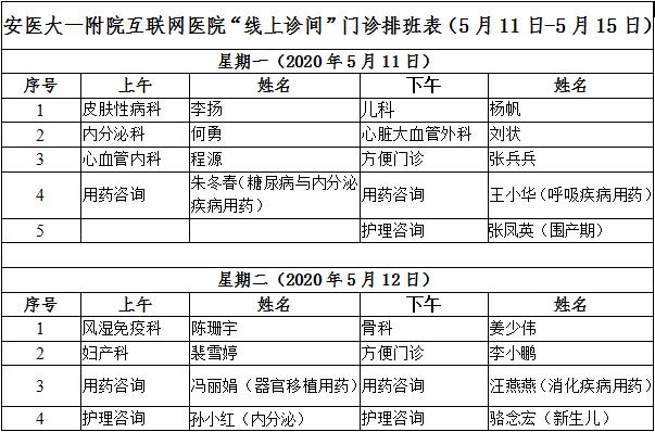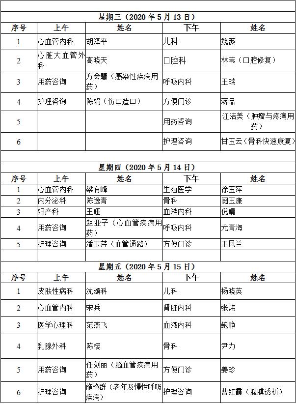 5月11日至5月15日互联网医院“线上诊间”门诊排班如下: