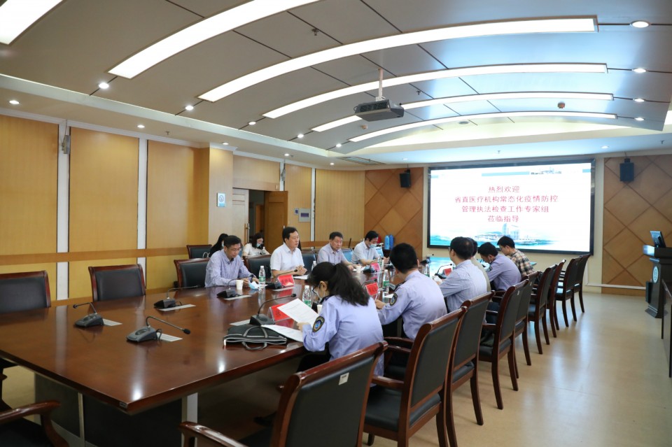 5月14日上午,省卫健委综合监督处处长夏北海率专家组来院开展省直医疗机构常态化疫情防控管理工作执法检查。医院在干部保健中心二楼会议室召开专项工作汇报会,院长梁朝朝,副院长费广鹤,党委副书记戴晓支,副院长、高新院区院长孙国平及相关职能处室负责人参加了会议。会议由副院长费广鹤主持。