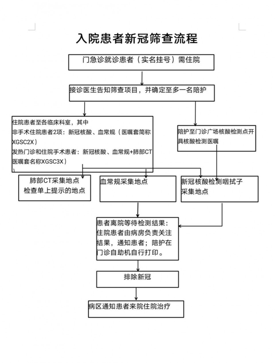 注:一个月内再次入院者已进行排查无异常可免做新冠排查项目。孕妇可免做CT检查,14周岁及以下儿童可用胸片替代CT检查。两周内三级医院肺部CT检查及一周内三级医院及有资质检测机构出具的检验结果互认。