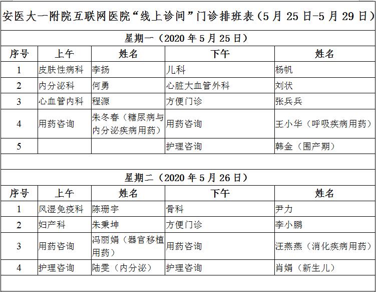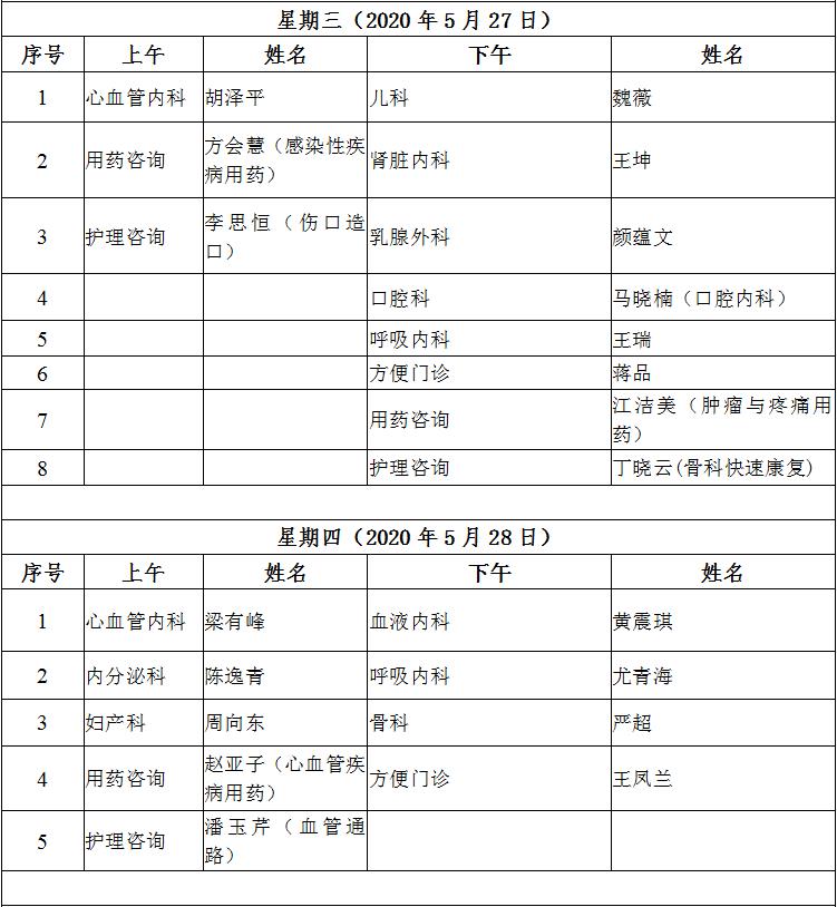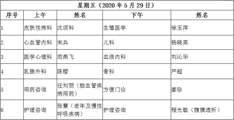 5月25日至5月29日互联网医院“线上诊间”门诊排班如下: