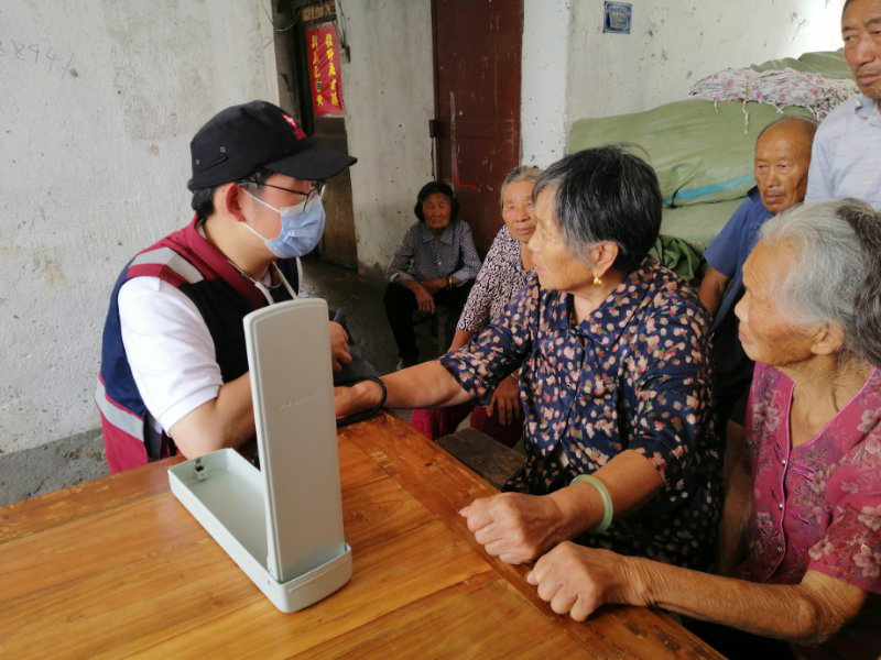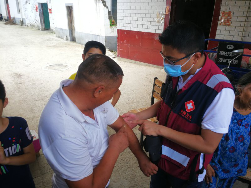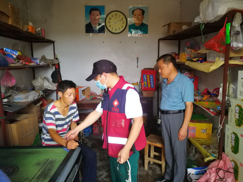 在巡诊现场,医疗队仔细询问病情,认真体格检查,耐心医嘱交代,得到了乡亲们的热情欢迎和连声感谢。期间,急诊内科副主任医师丁振兴在当地村干部的带领下,来到贫困户家庭,为几位患有多种慢性疾病的受灾群众上门问诊。在与驻点医生详细了解情况后,丁振兴均给出了具体诊疗方案,一一嘱咐驻点医生,并留下微信便于联系。皮肤科主治医师丁延涛来到一位80多岁老人家里,借着手机闪光灯查看老人皮疹情况,确定了病因,并向驻点医生给予详细的药物指导。胃肠外科周红方护士在现场给几十位受灾群众测量了血压、心率,尽管耳朵被听诊器磨得生疼,但看到大伙对“省医疗队”的期待,仍坚持到了最后。