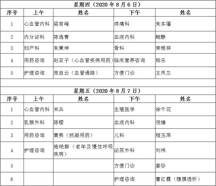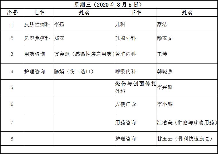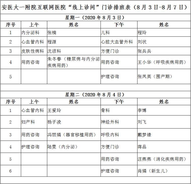 8月3日至8月7日互联网医院“线上诊间”门诊排班如下: