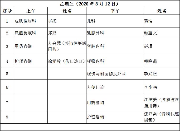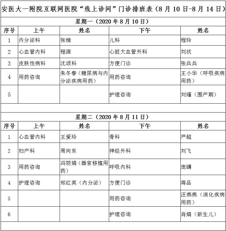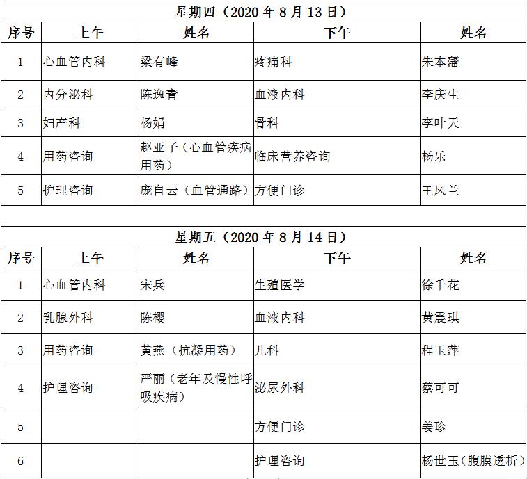 8月10日至8月14日互联网医院“线上诊间”门诊排班如下: