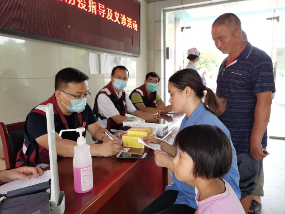 义诊活动开始前,灾区群众骑着电动车,推着板车,早早地来到卫生院排队就诊咨询。医疗队专家们热情接诊每一位前来就诊的群众,详细地询问病史,耐心讲解合理膳食、培养健康生活方式等相关知识,发放了健康教育处方,同时为一些因水灾造成的皮肤疾病患者免费发放了药品。