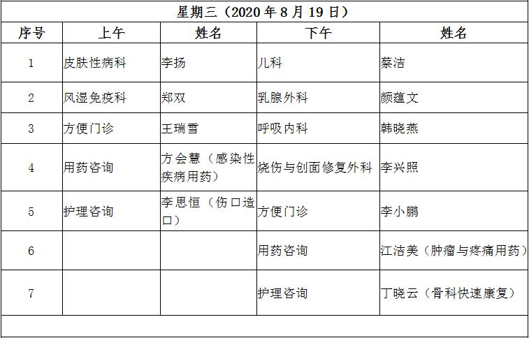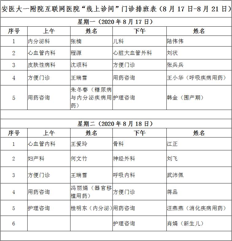 8月17日至8月21日互联网医院“线上诊间”门诊排班如下: