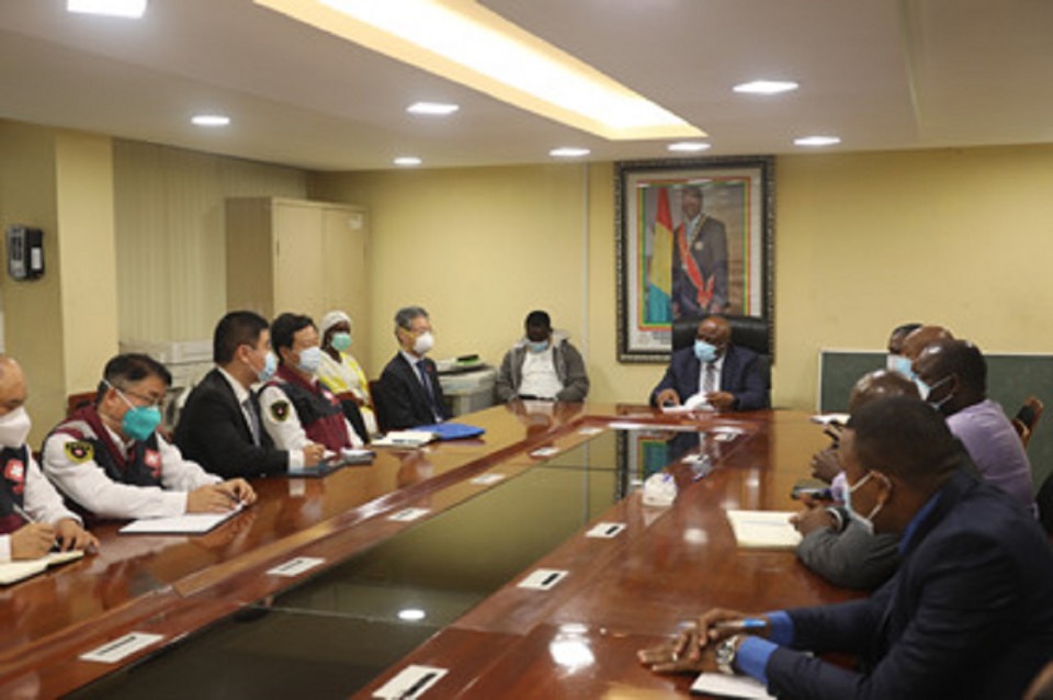 8月31日,驻几内亚大使黄巍陪同中国抗疫医疗专家组会见几内亚卫生部长拉马。
