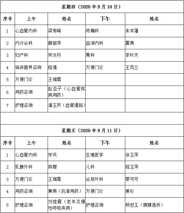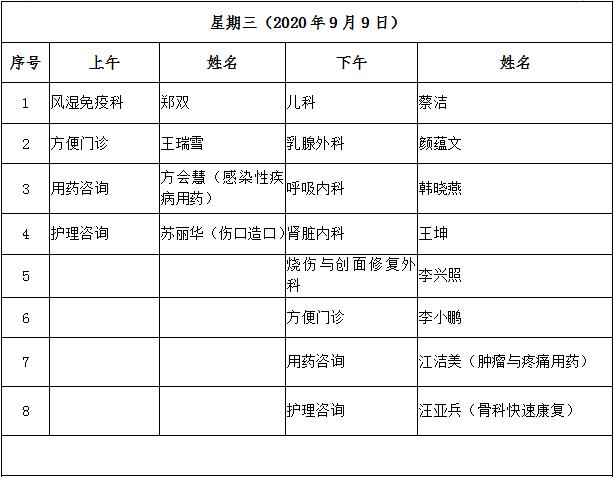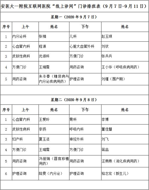 9月7日至9月11日互联网医院“线上诊间”门诊排班如下: