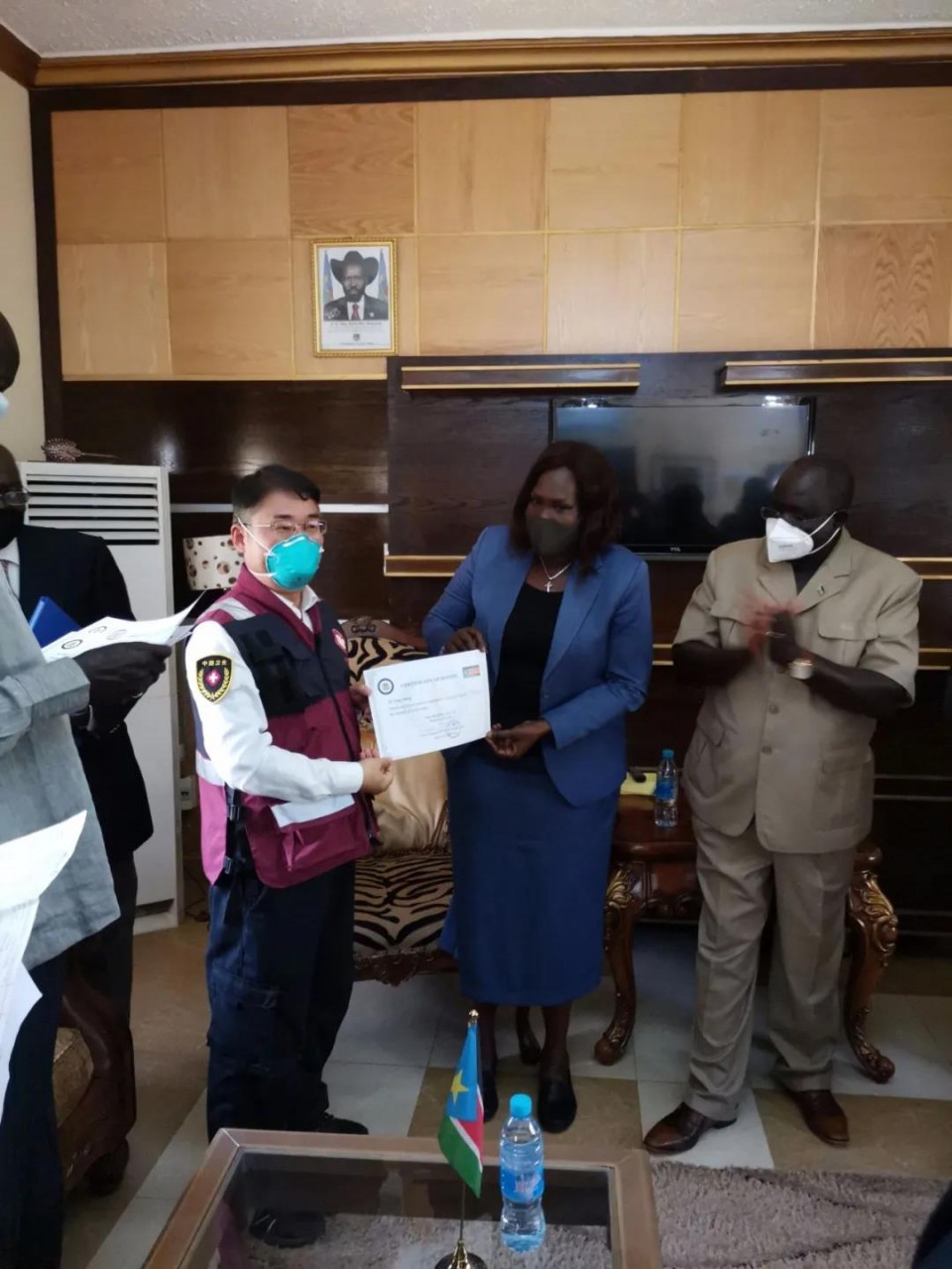 华宁大使表示,中国援南抗疫医疗专家组是中非团结抗疫特别峰会后中国政府派往非洲的首批专家组,体现了中国政府和人民对南苏丹的特殊友好情谊。专家组从抵南第一天起,就不知疲倦开展工作,受到南政府及社会各界高度肯定,为南防疫工作作出重要贡献,促进了中南两国友好合作。面对前所未有的疫情挑战,全球各国都应守望相助、紧密协作。中方将以专家组访南为契机,继续加强同南方抗疫和卫生合作,为南苏丹及非洲尽早成功控制疫情、共同构建中非卫生健康共同体作出更大贡献。