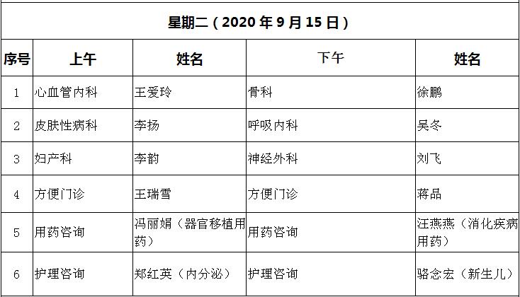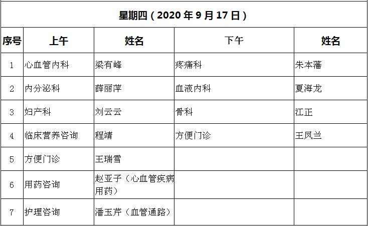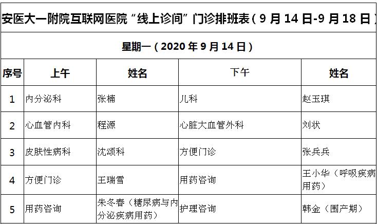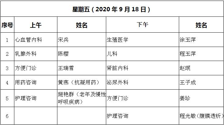 9月14日至9月18日互联网医院“线上诊间”门诊排班如下: